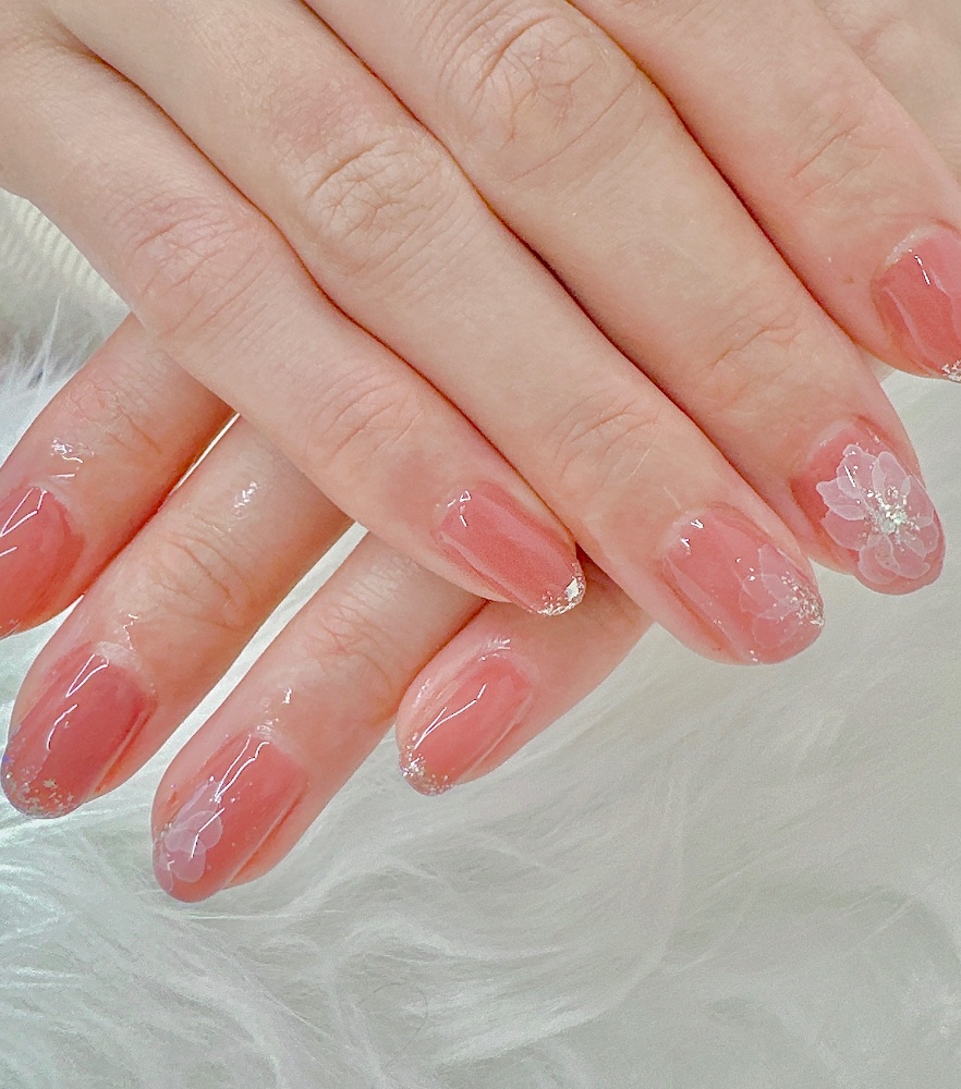 お花を描いていない指にはサブアート(ラメを部分的に乗せたり、
